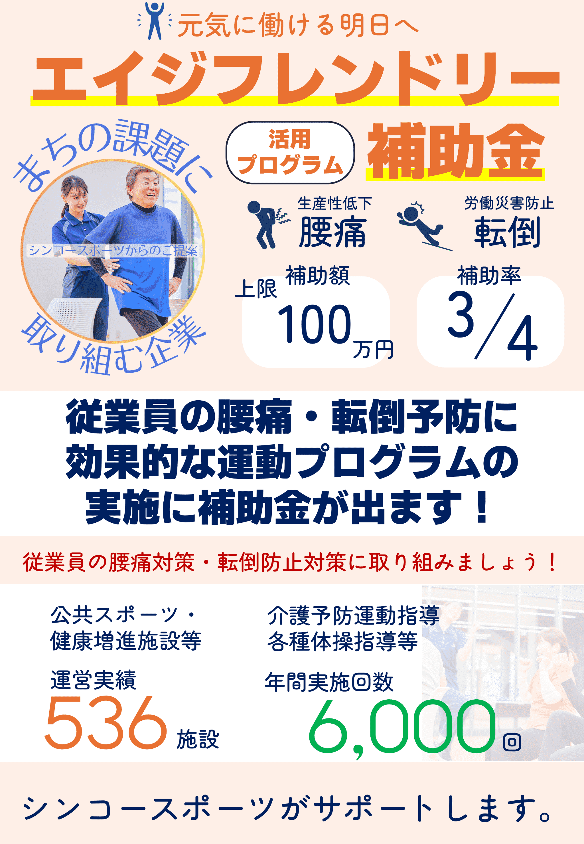 「ラウンドフィットネス🄬」は「どなたでも」「安全に」トレーニングできる機器とステップ運動を組み合わせたサーキットトレーニングであり、シンコースポーツグループが全国でお預かりする運動施設で導入を進めております。